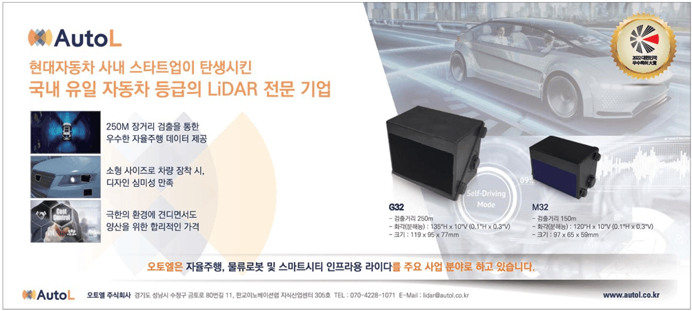 오토엘은 ‘경사진 미러 구조를 가진 라이다’ 기술 특허를 통해 부품 추가 및 부피 증가없이 자동차 내구 신뢰성을 만족하는 고해상도 라이다 G32를 개발했다. G32는 제품의 구조를 단순화하면서 해상도와 검출 거리를 극대화해 양산 시 동일 사양의 기존 라이다 대비 1/5의 저렴한 가격으로 공급이 가능할 것으로 기대된다.